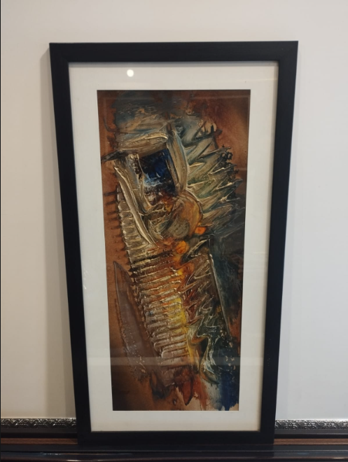 A striking abstract painting that blends deep earthy tones with metallic textures, evoking a sense of movement and raw energy. Bold strokes of bronze, rust, and steel-like hues intertwine to create a powerful composition, framed in sleek black to enhance its dramatic presence. Perfect as a centerpiece for modern interiors, this artwork captures the beauty of chaos and structure in harmony.
