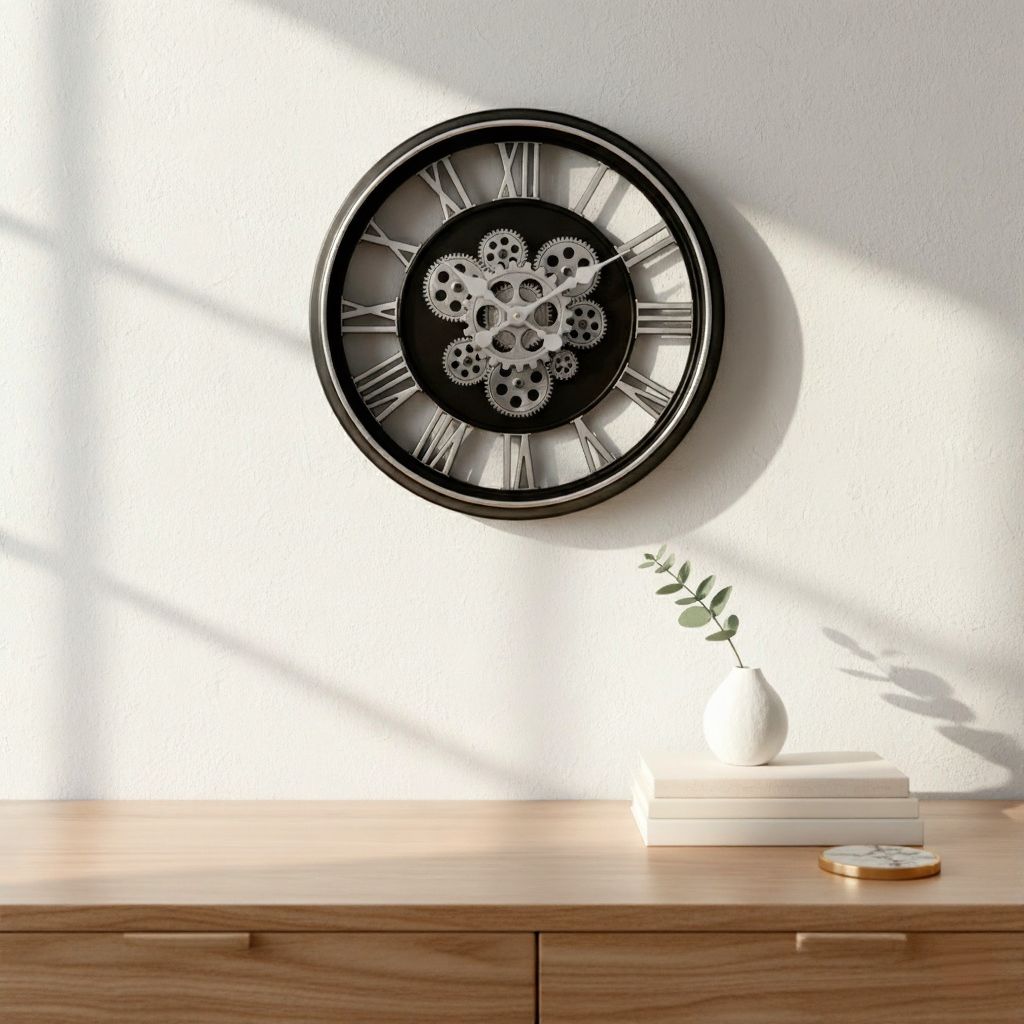 The EternaGear Roman Timepiece blends classical elegance with mechanical precision. Its bold Roman numerals encircle a captivating centerpiece of interlocking gears, symbolizing both strength and continuity. The polished black frame provides a sleek contrast, making the silver gears and ivory-white hands stand out with timeless clarity. Designed for those who appreciate the fusion of art and engineering, this clock is not just a way to tell time—it’s a statement of sophistication and enduring style.
