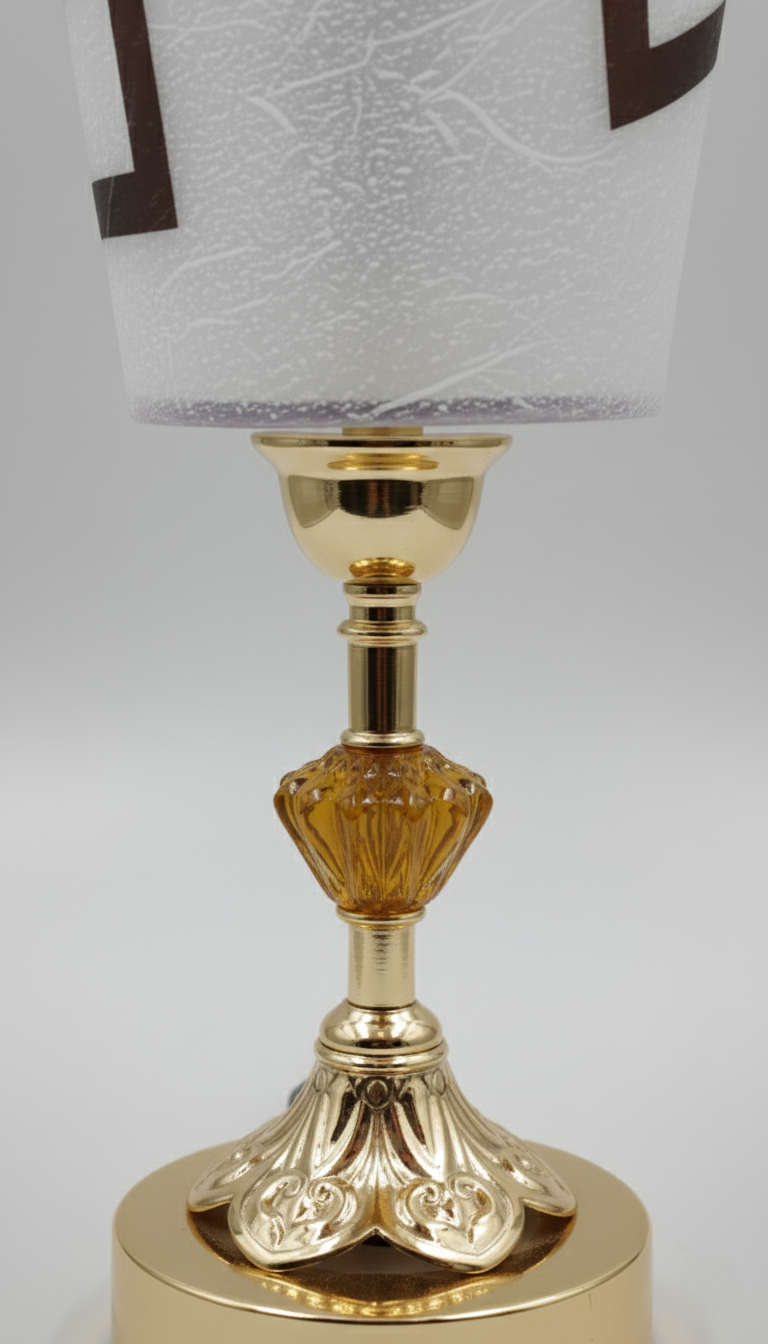 The lamp's base is a statement of refinement, featuring a beautifully polished gold finish and a faceted crystal stem that catches the light, creating a dazzling effect. This metallic and crystalline foundation speaks to a premium, high-end feel.
