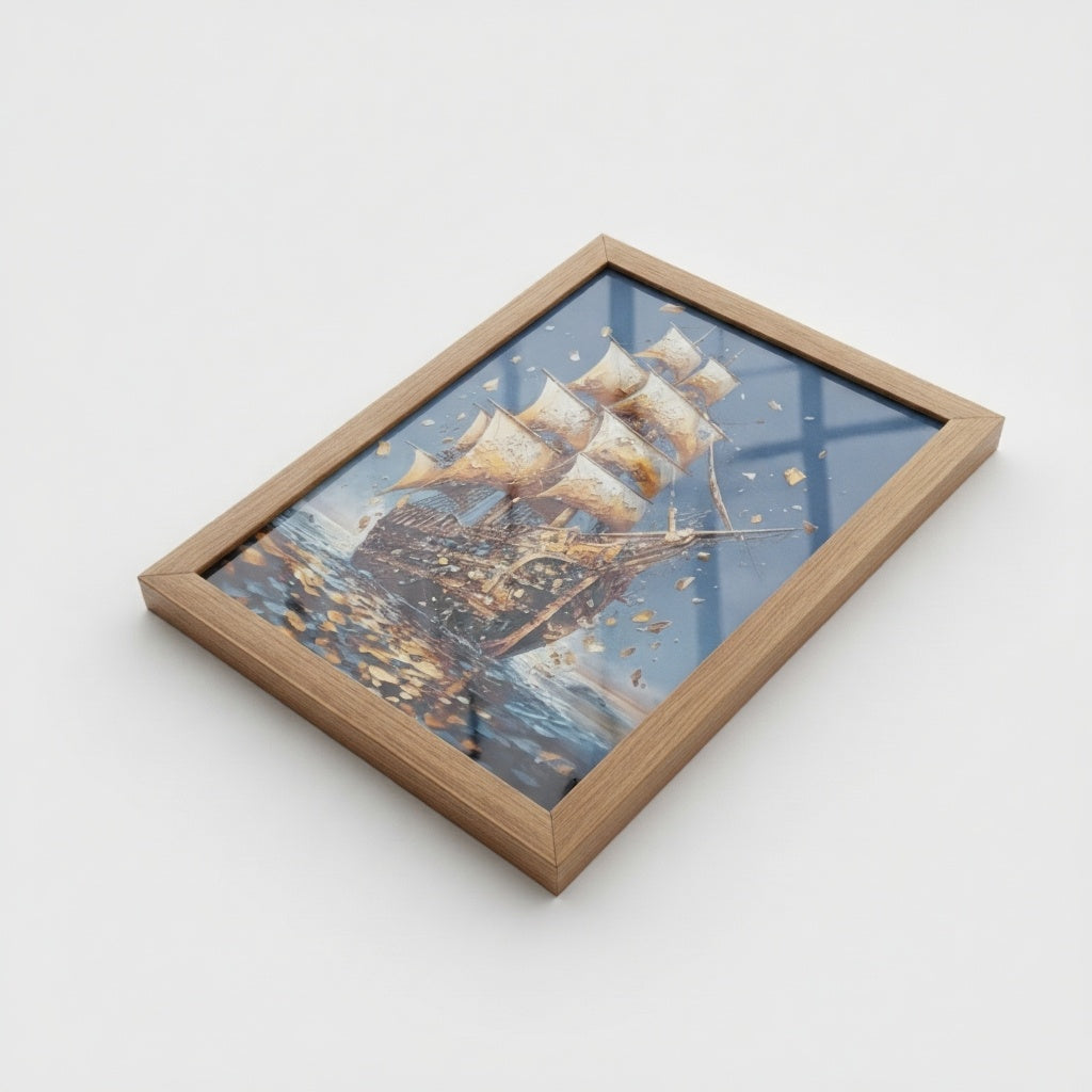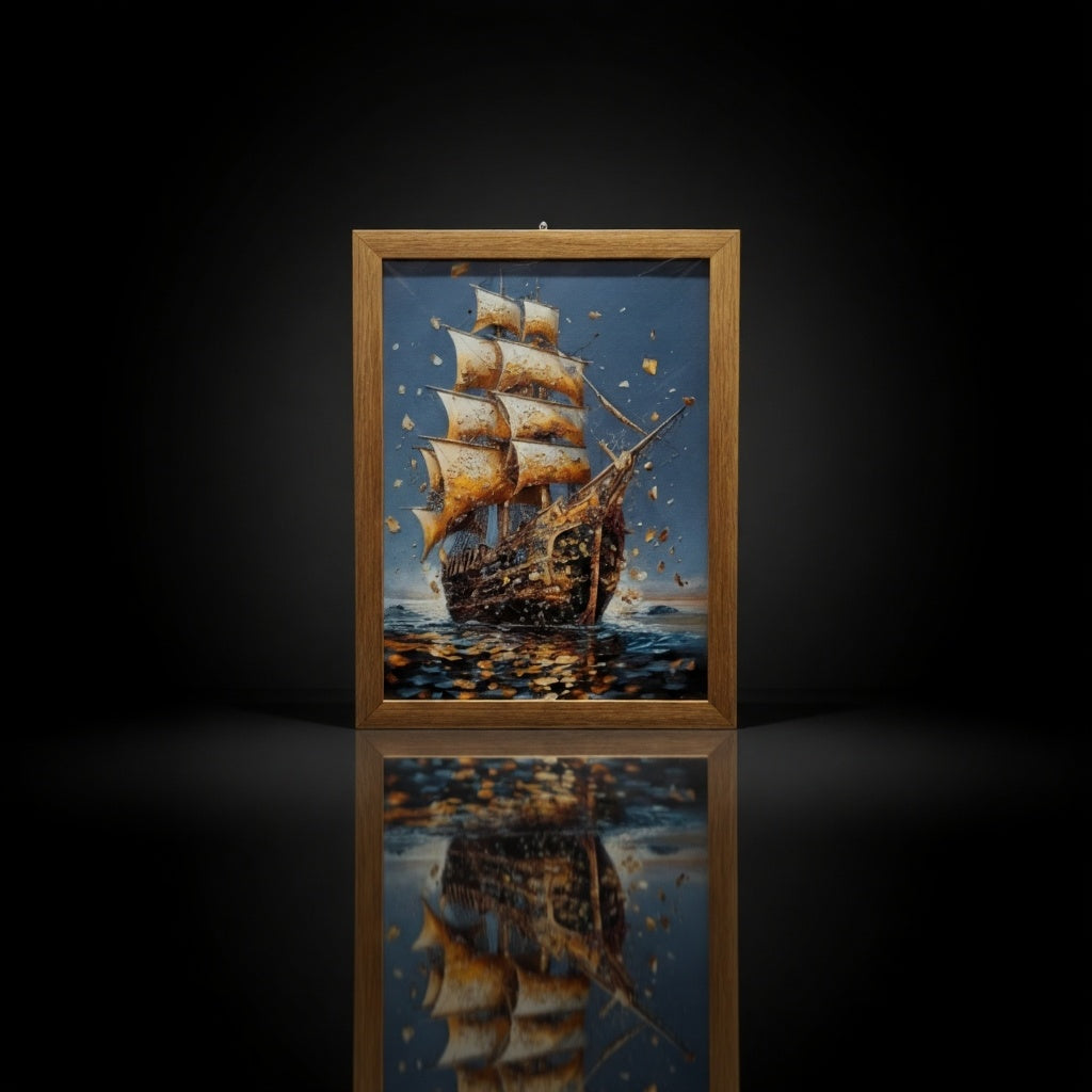 This artwork portrays a majestic galleon gliding across calm waters beneath a star-strewn sky. Deep ocean blues contrast with the ship’s sunlit sails, creating a dynamic interplay of light and shadow. The composition captures both tranquility and grandeur — a moment suspended between stillness and exploration. Evoking themes of adventure and discovery, it serves as a striking centerpiece that inspires reflection and imagination in any space.